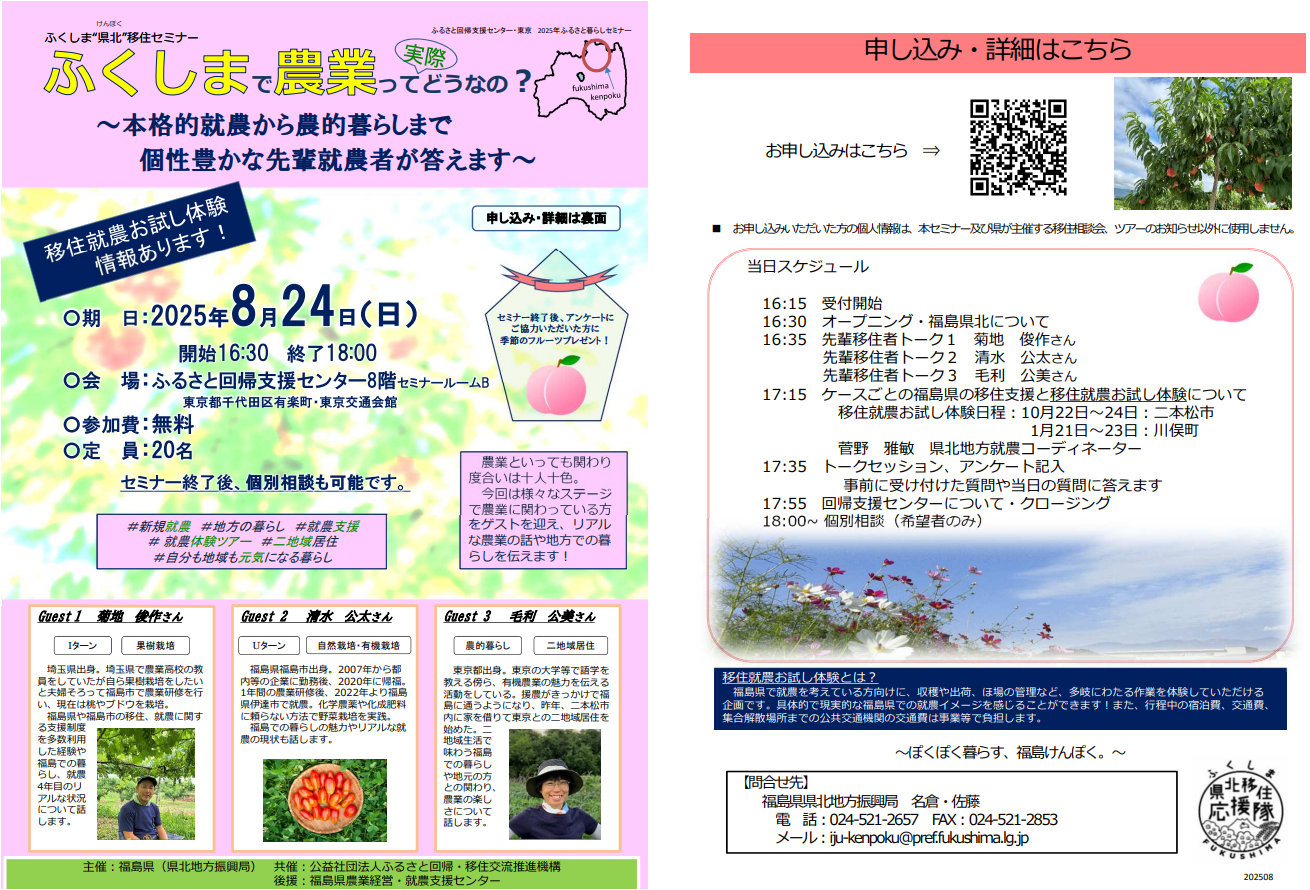 本セミナーでは福島県県北地方に移住して本格的就農をされている方、兼業農家の方、二地域居住で農的暮らしをされている方など個性的なゲストを迎え、就農前から現在の暮らしに至った経緯や新規就農のリアル、地方での暮らしについて3人の先輩方の話をお聴きします。