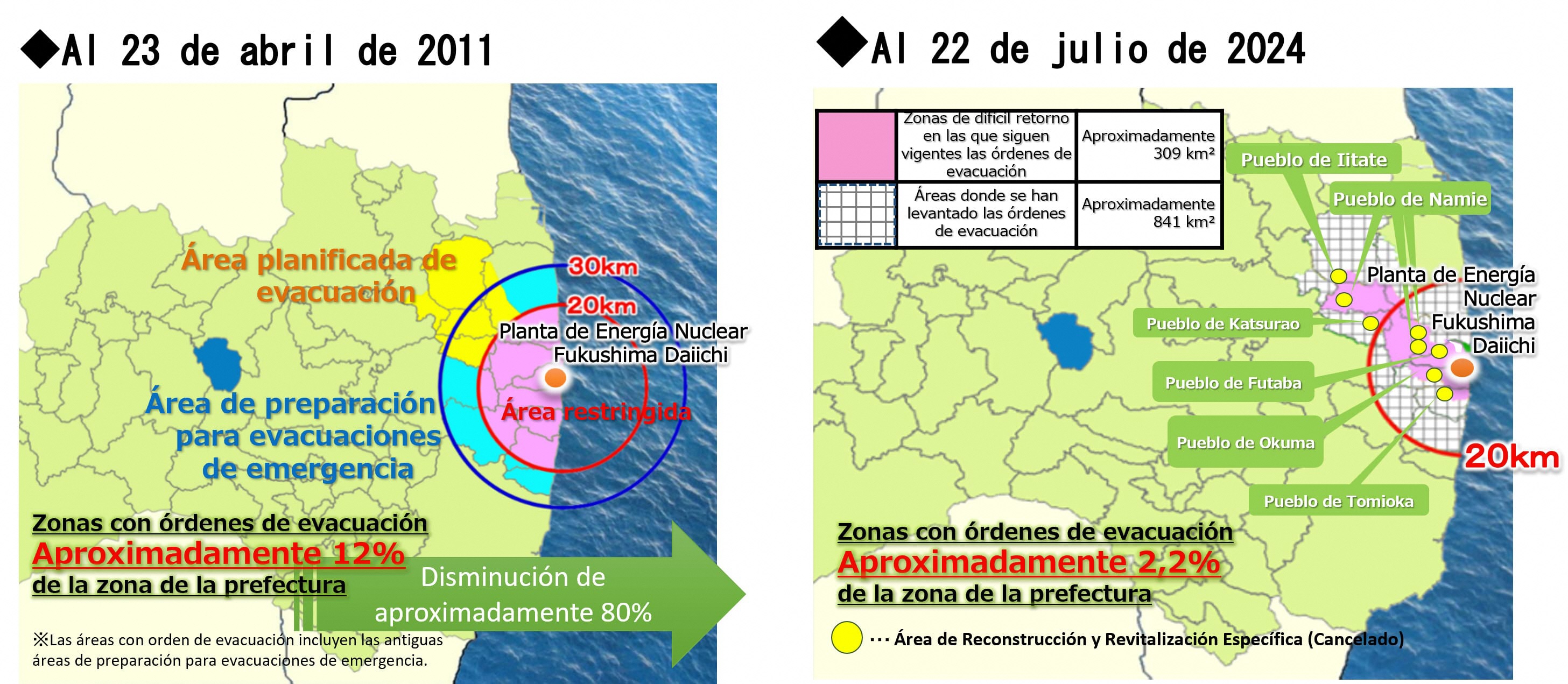 Entre junio de 2022 y noviembre de 2023, se levantó la orden de evacuación en todas las áreas de las seis poblaciones (los pueblos de Tomioka, Okuma, Futaba, Namie, y las aldeas Katsurao e Iitate) de las zonas base de reconstrucción y revitalización designadas