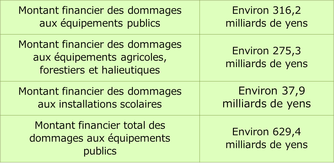 *Montant financier des dommages estimés à partir de photographies aériennes, etc., à moins de 30 km de la centrale nucléaire de Fukushima Daiichi des territoires sous la juridiction du département. Juridiction municipale, à l'exclusion d'une partie de la ville de Minamisoma et de 8 villes et villages du district rural de Futaba