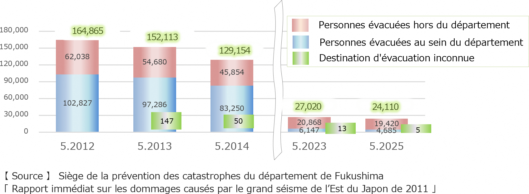 Le nombre de personnes évacuées a culminé à 164 865 en mai 2012 puis a diminué depuis. Actuellement, environ 24 000 personnes sont encore sujettes à évacuation.