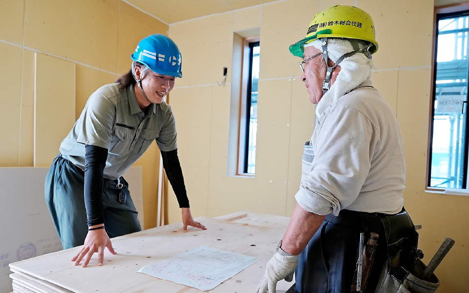 建築の仕事は、お客様・下請けの会社・自分の会社の三者間との連絡や調整が大変です。いろいろな人の意見を聞きながら作業を進めています。