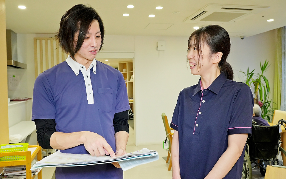 明るく元気な人が多いので、働きやすい職場です。困ったことがあれば、誰にでも相談できます。みんな介護の仕事に真剣に向き合っています。
